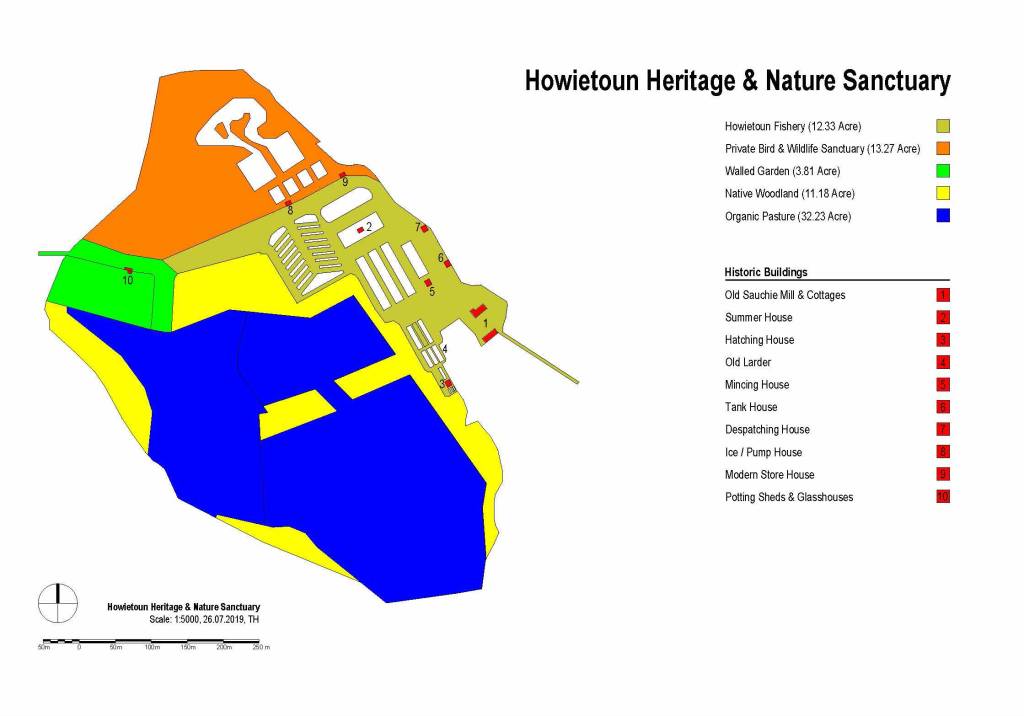The existing 75 acre land holding, situated 4 miles south-west of Stirling, comprises of a variety of Historic Buildings, the historically significant Howietoun Fishery, a Private Bird & Wildlife Sanctuary, the Old Sauchie Walled Garden, a recently planted Native Woodland and surrounding Organic Pasture, all of which were once part of the Sauchieburn Estate held by the Ramsay Steel-Maitland Family.